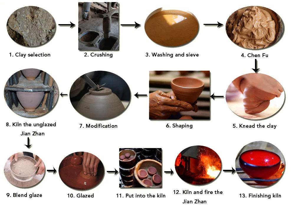 The clay and glaze used in tenmoku chawan ( jian ware, jian zhan ) ceramics require a high iron content. While other kilns during the Song Dynasty attempted to replicate Jian Zhan, they often failed because the mineral composition in their local materials couldn't meet the necessary standards for producing authentic Jian Zhan. - Crushing: